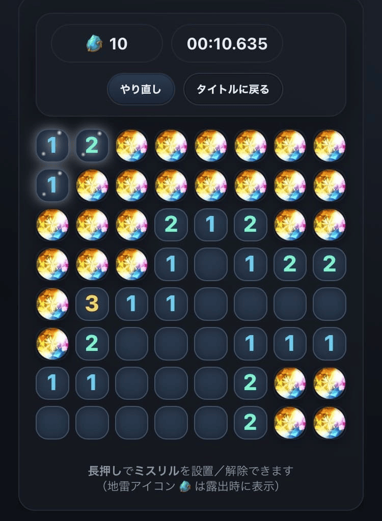 数値はそのマスの周囲8マスに対してアニマレンズが幾つ存在するかの情報になりますので、その数値をもとにアニマレンズの配置場所を推測しながらゲームを進めていきます。