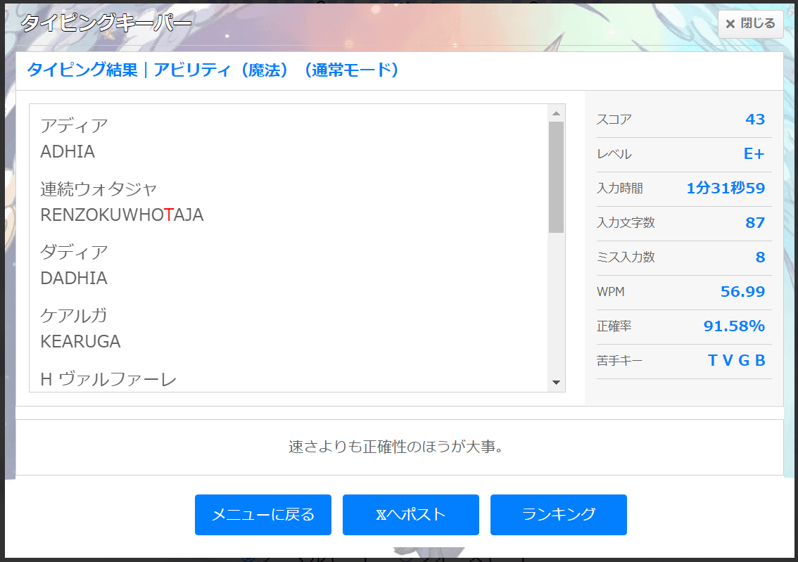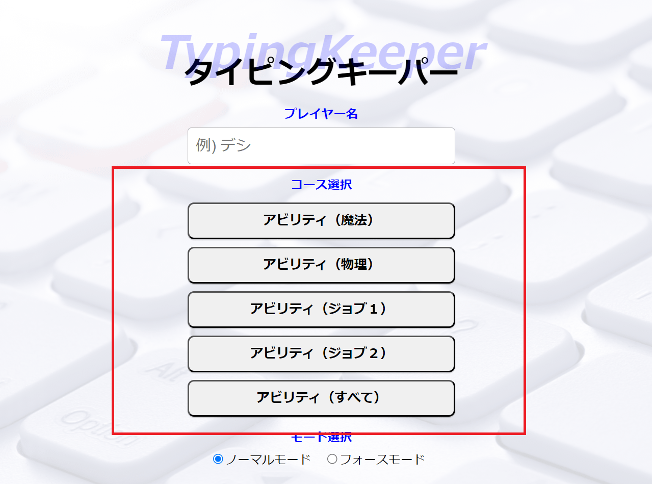 本ゲームはe-typing風のタイピングゲームです。表示されるアビリティの名称をタイピングを行い、その正確さと速度でスコアを競うゲームになっています。