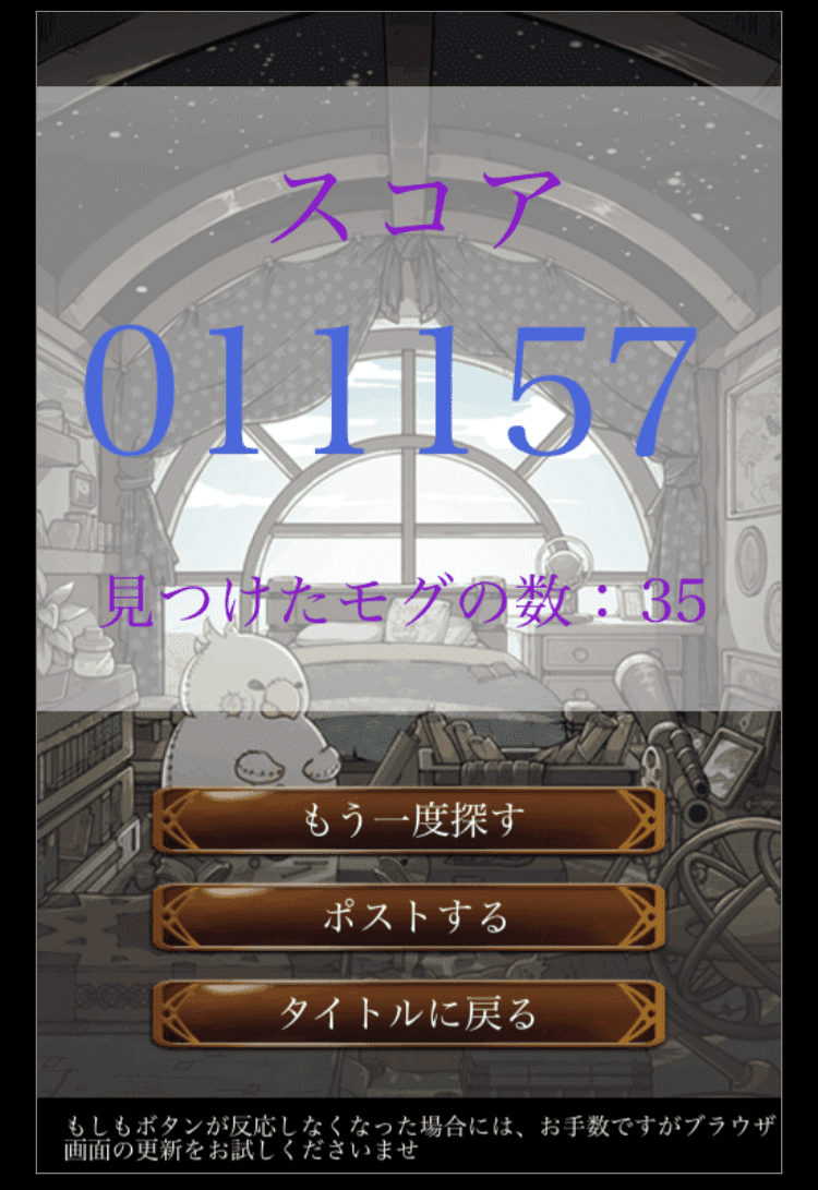 結果画面では最終的なスコアと見つけたモグの数を確認する事が可能です。