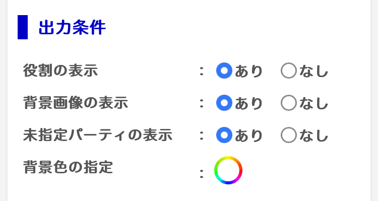役割の表示・非表示、キャラクターの背景画像の表示・非表示、画像全体の背景色の指定を行うことが可能です。