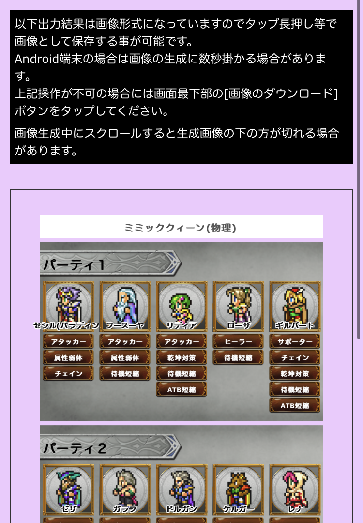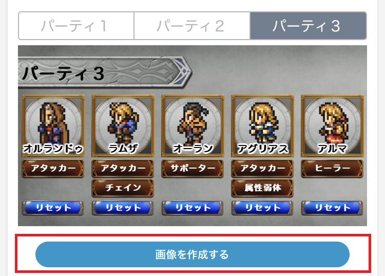各パーティの設定、ダンジョン名(任意)、出力条件の設定(任意)を行った後、[画像を作成する]ボタンをタップすると