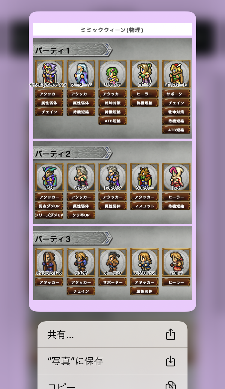 本機能ではギガスコロシアムのパーティ構成を検討・結果を画像として保存する事が可能です、メモや他者との共有、相談やアドバイスなどで使って頂く事が可能です。