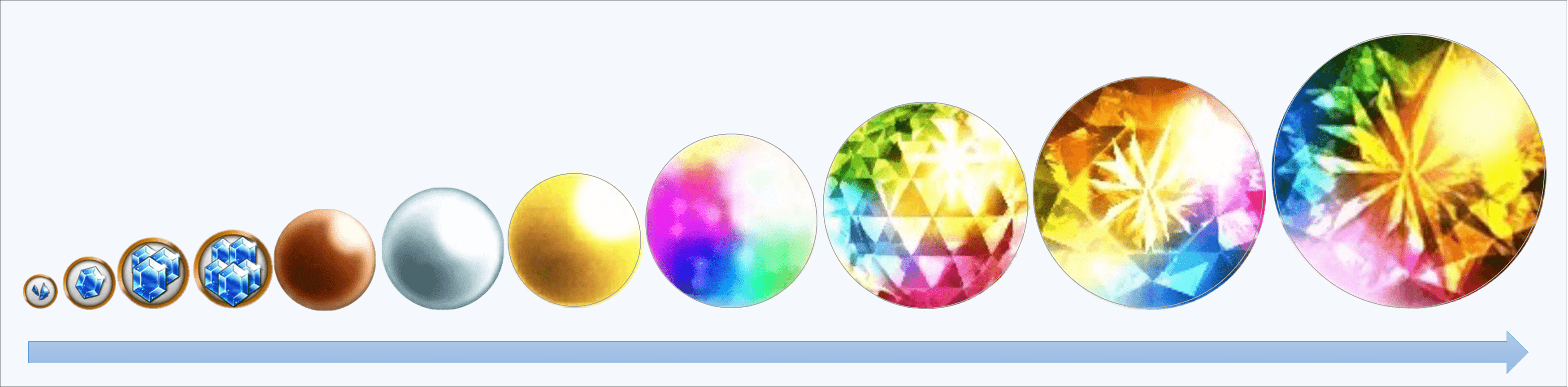 装備召喚の玉は全部で11種類、したのイラストの順に進化されます。