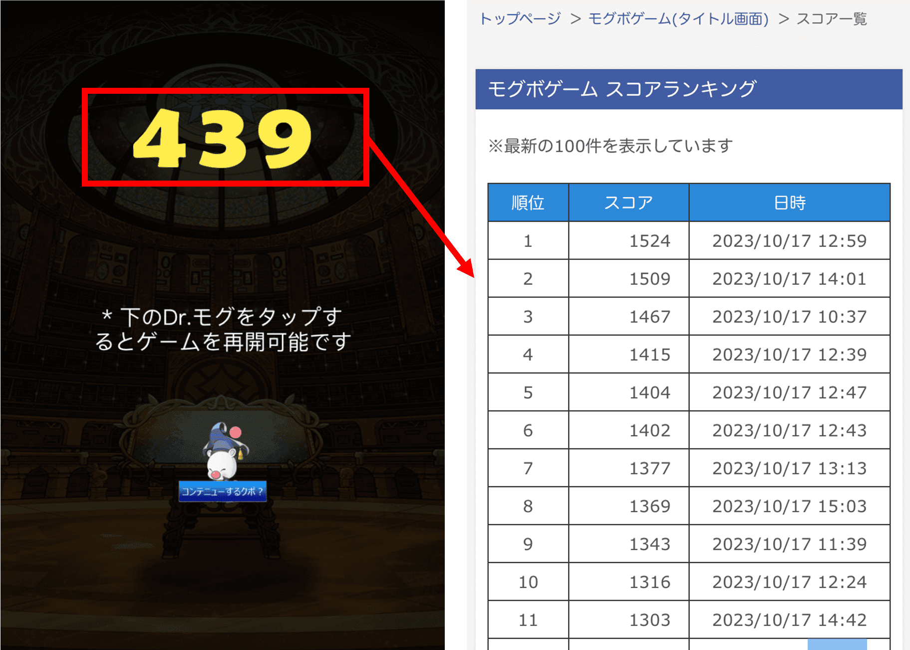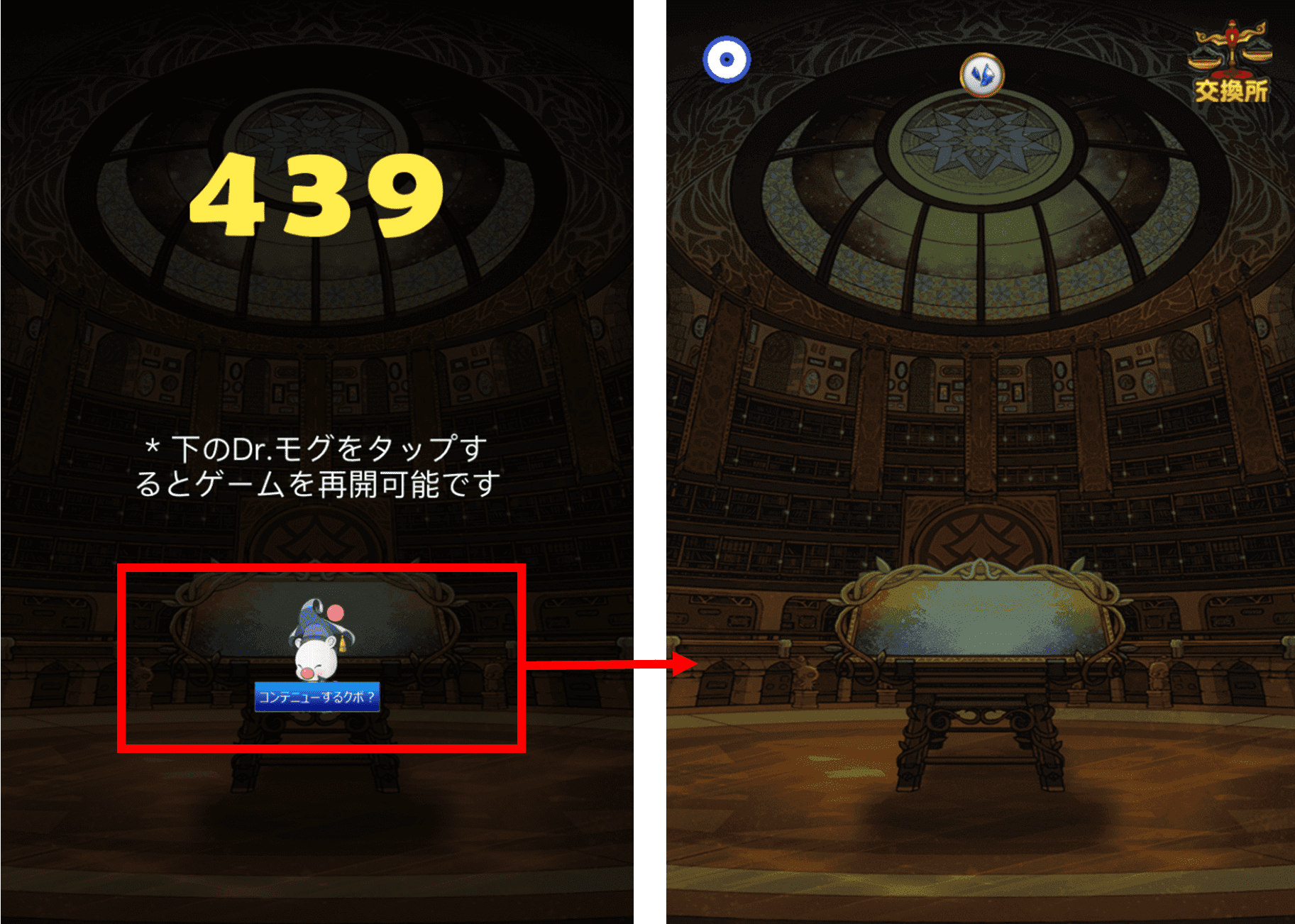 ゲームオーバー後にリザルト画面まで進み、Dr.モグをタップするとコンテニュー(ゲームを再開)する事が可能です。